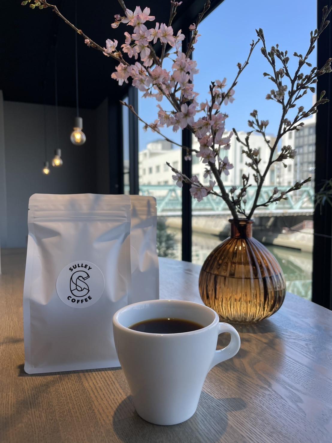 大きな窓の外を流れる川の風景。